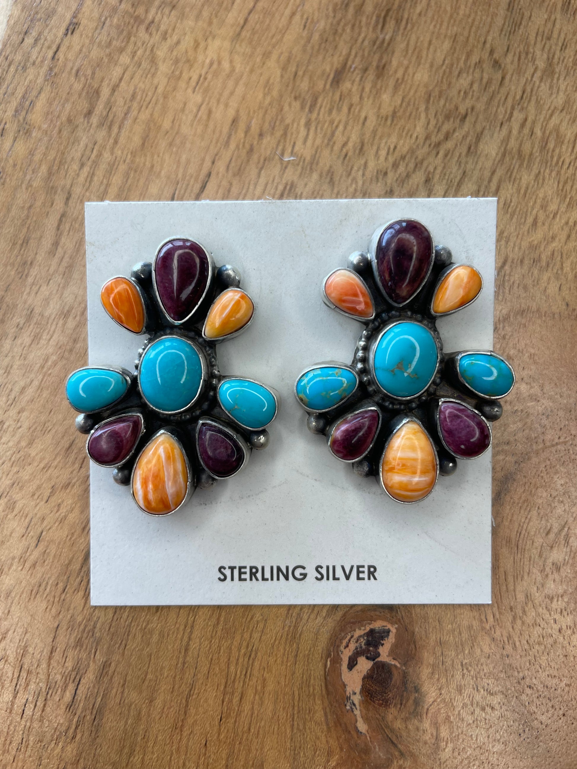 I love these. I love the vibrant colors of these studs. A mix of purple spiny oyster, Kingman and orange spiny oyster. Handmade by Navajo silversmith Lorenzo Juan.
