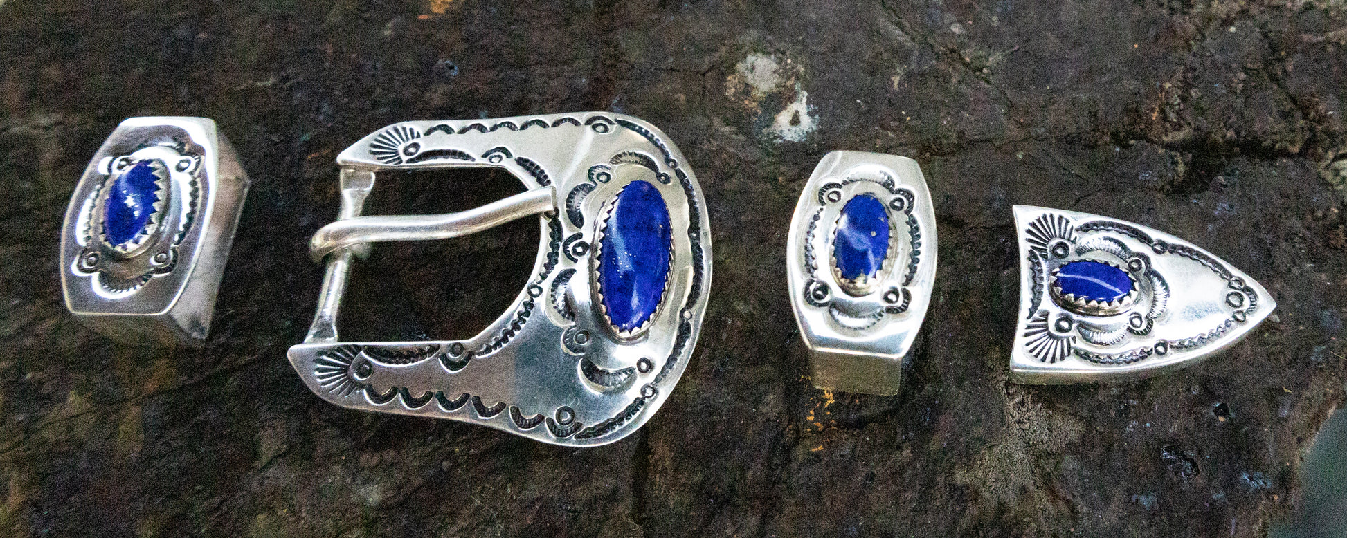 Gorgeous four piece Lapis and sterling silver belt buckle set. All sterling silver and stamped. The buckle is made for a belt that is 7/8" wide.