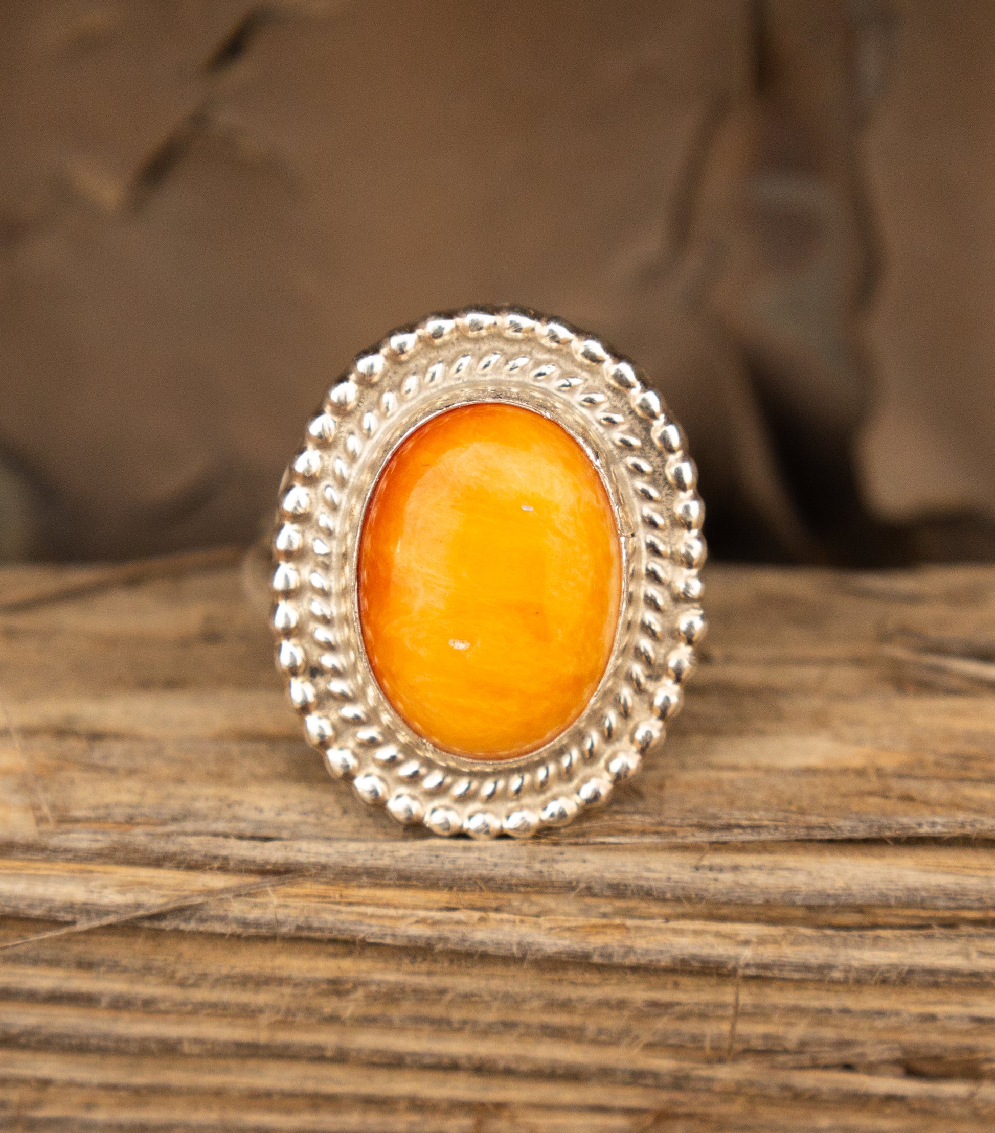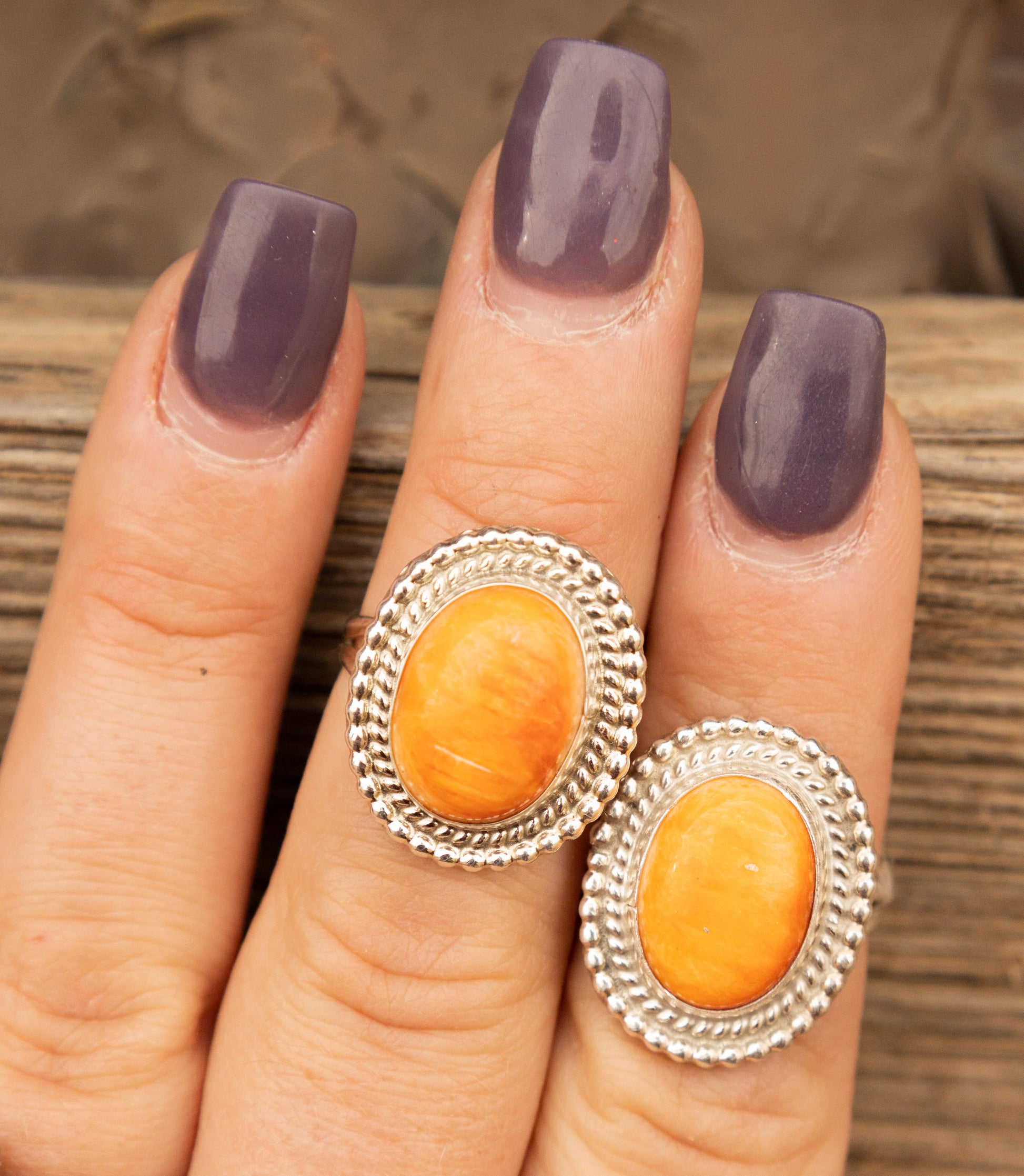 Dainty orange spiny oyster ring by Navajo silversmith J. Fran. Set in sterling silver. Signed and stamped.